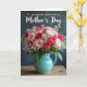 This card features a full, carefully arranged bouquet in an aqua ceramic pitcher, set up like a thoughtful gift shared between close family ❤️. Roses in deep fuchsia, creamy blush, and soft pastel pink crowd together, their gently opening petals suggesting a tender, appreciative gaze. Airy clusters of tiny white flowers weave through the arrangement like soft whispers between friends, adding lightness and contrast. Soft, diffused lighting highlights the curves of each bloom and the smooth shine of the pitcher, keeping the mood calm and affectionate. The message “To my wonderful mother-in-law on Mother’s Day” sits across the lower portion in flowing lettering, shown in a light color that stands out clearly. Behind the flowers, a deep blue-green background stays slightly textured and subdued, while a rustic wooden surface below adds warm, homey detail 🌼. The pitcher rests slightly left of center, with the brightest pink roses rising near the top edge and small white blossoms scattered around them.