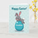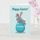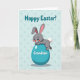 This card shows a sweet grey bunny with pink-lined ears, a tiny red nose, and rosy cheeks, leaning forward as if sharing a shy, friendly moment 🐰. It sits perched on a large teal egg, with its front paws resting gently on the curved surface and a fluffy white tail peeking out behind. The background is light aqua blue with faint, lighter polka dots that keep the scene airy and calm. Near the top, the words “Happy Easter!” appear in turquoise letters with a thin outline, centered above the bunny and egg. On the egg itself, the word “Grandson” is placed across the front in a simple white font that stands out against the teal. Soft shading on the bunny’s fur and the egg’s surface adds depth, like a quiet spotlight meant for a close bond 🌷. The teal egg has smooth gradients and a glossy look, set against the pale dotted backdrop.
