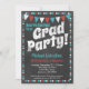 A funky chalkboard aqua and red graduation party invitation featuring chunky text "Grad Party!" at the top with chalkboard background, flags and a cute polka-dot border.