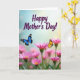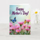 Designed with a dreamy sky background that shifts from soft aqua into a gentle warm yellow, this card sets a tender, sunny mood. Near the top center, the words “Happy Mother’s Day!” appear in flowing plum lettering, standing out clearly against the light gradient. Scattered behind the text are softly blurred, glowing light circles that feel like distant sun flares. In the foreground, a meadow of daisy-like flowers stretches across the bottom, with pink petals wrapped around sunny yellow centers and slim green stems. The closest blooms are sharp and inviting while the farther flowers fade into a soft haze, creating a cozy, affectionate scene ❤️. Two butterflies add motion and closeness: one with bright blue wings edged in black and white glides above the flowers, while another with orange wings marked by black lines and white spots rests near a blossom 🌼. The orange butterfly leans toward a pink flower at the lower right, its wings angled slightly open beside the yellow center.