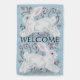 Perfect for Easter or spring, this pretty garden flag features two adorable white bunny rabbits with stylized vines and leaves, on an aqua blue background. Customize with your name on one side of this flag; "Welcome" is printed on the other side of this quality flag for your garden, walkway or home entrance. Welcome guests at your outdoor gatherings too, even at your Easter egg hunt! It's easy to personalize this flag using the "Personalize" prompt on the product page.Whimsical, original artwork & design by Tuzi Williams.