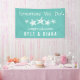 Welcome guests with our beachy personalized banner, perfect for rehearsal dinners or wedding welcome parties. Design features a solid aqua background with white starfish illustrations and three lines of custom text. Shown with "Tomorrow We Do!" and a congratulatory message with the couples' names.