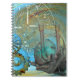 Fantasy digital graphic features a snail shaped Steampunk time travel machine with abstract aqua background