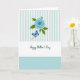 Designed with three horizontal sections, this card keeps the layout calm and balanced while still drawing your eye upward. The top area shows alternating vertical stripes in soft aqua and white, like a breezy backdrop on a quiet morning. Slightly off-center, a deep blue rose opens in layered petals, with green leaves tucked around it as if gently protecting it ❤️. A bright blue butterfly with detailed wing markings rests lightly on the stem, adding a sense of closeness and soft attention, like a small companion staying near. Beneath the flower, a wide white band holds the message “Happy Mother’s Day” centered in flowing blue lettering, easy to read against the pale space 🌼. The bottom section is a solid light blue panel that echoes the lighter tones above and keeps the whole design feeling unified. The rose and butterfly sit above the white message band, with the striped background behind them and the light blue base below.