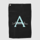 Back and Aqua Teal Blue Monogram Name Golf Towel. This makes the perfect sweet 16 birthday, wedding, bridal shower, anniversary, baby shower or bachelorette party gift for someone that loves glam luxury and chic styles.