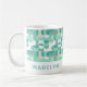 Beautiful contemporary aqua teal, seaglass mint green, and white colored geometric circles and half circles pattern on a white background. With the option to customize or personalize with a name, monogram, or initials of your choice. Ornate, elegant, stylish, and eclectic design for the fancy artistic fashionista, the artsy fashion diva, popular hip trendsetter, vintage retro art style, and abstract digital geometric motif lover. Show off your style, look fashionable, and feel stylish with a unique design on a coffee or tea mug of your choice.