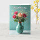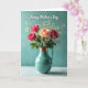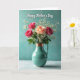 This card features a still-life bouquet arranged in a glossy teal vase with a copper-toned rim, set against a muted aqua background that feels calm and intimate. Four roses take center stage—two deep pink blooms, one soft blush rose, and one peachy-orange flower opening as if leaning toward the others in quiet affection ❤️. Airy clusters of tiny white filler flowers weave between the roses, adding a light, lacy texture that softens the scene. Gentle, diffused lighting creates smooth highlights on the vase and brings out the layered petals, like a tender moment shared between close friends. Subtle green tones with a slightly mottled texture appear around the bouquet, helping the warmer flower colors stand out without feeling harsh. The message “Happy Mother’s Day” sits across the upper area in white lettering that contrasts clearly with the cool background 🌼. A few pale petals are scattered beneath the vase, resting on the surface in small, delicate shapes.
