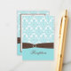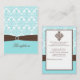 This aqua blue, white, and chocolate brown reception enclosure card with a FAUX ribbon and jewelled brooch matches the wedding invitation shown below. There is an area on the back for you to include directions to your venue(s), if required. You can delete the text if not needed and lower the reception info by using the customize button and then clicking on design. If there are any other matching items you require, please email me your request.