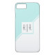 Aqua blue and white geometric iPhone 8/7 Case with monogram. The front includes two diagonal stripes one aqua and one white that separate the card in two triangles. A white square is on the center with your monogram.