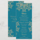 A beautiful aquamarine aqua blue JEWEL TONED and gold wedding menu card with an exotic Indian inspired ornamental sari MEDALLION pattern WITH A FLORAL AND LOTUS SUNBURST DESIGN. This elegant and beautiful modern Indian style wedding invite is perfect for any formal occasion WITH AN EAST ASIAN INDONESIAN MOROCCAN ALADDIN OR ARABIAN NIGHTS THEME. Designed by Chrissy H. Studios, LLC. All Rights Reserved.