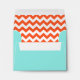 Stylish wedding response RSVP envelope done in aquamarine, on the outside, with an coral stripe on the back flap, and a fashionable coral orange and white zigzag chevron pattern on the inside of the envelope. Black address, on the front, is ready to personalize. Elegant finishing touch to our stylish Coral and Aquamarine Chevron wedding response cards. More matching products available.