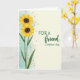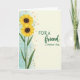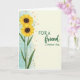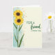 This card features two tall sunflower-like blooms along the left side, their golden petals opening around deep brown centers as if leaning toward each other in quiet affection ❤️. Slender green stems and pointed emerald leaves guide your eye upward, adding a gentle sense of closeness and support between the flowers. Behind them, a soft aquamarine wash spreads like diluted paint, giving the scene an airy, calm setting. Small burnt-orange specks drift across the blue area like scattered pollen, adding warmth and a light, friendly sparkle. The right side opens into a creamy, parchment-toned space that feels calm and inviting. A short message sits centered on that pale area in dark forest green, with the first line in a classic serif style and a second line in a more flowing, cursive-like style, like a note left with care 🌼. The cream panel stays mostly open, framed by the cool blue edge on the left and a few faint orange flecks near the boundary.