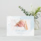 PixDezines Thank you and Birth Announcement for a baby boy with powder blue watercolor background and faux rose gold confetti, accented with butterflies and faux gold pram..