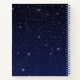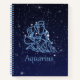 Spiral notebook featuring the symbol for Aquarius in soft silver blue, overlaid with the stars of the constellation, against a starry sky background graded from deep midnight blue to black.