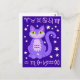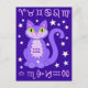 A purple smiling cat with green eyes, curling tail, lucky stars, Aquarius horoscope sign logo on kitty's fur, with a midnight blue background and pale pink zodiac signs at top and bottom.