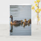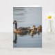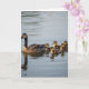 This design shows a graceful adult water bird on the left, neck lifted and head turned slightly to the right as it leads the way across calm water. Its feathers form dark brown and creamy stripes that catch a soft, golden light, giving it a gentle, caring presence. Five tiny chicks follow close behind, their fuzzy yellow bodies and small dark caps making them look like they’re tucked into the parent’s watchful attention ❤️. The group moves in a slight diagonal line, like a quiet procession where each little one stays near the others, suggesting closeness and trust. Near the top, a short greeting sits centered in a light-colored font, with a smaller line beneath it in a darker tone, keeping the message easy to spot without taking over the scene 🌼. The water is a muted blue-gray with faint ripples, reflecting the sky in a calm, glassy way. The background stays softly blurred so the family remains the focus, and each bird leaves a thin, delicate wake trailing behind them.
