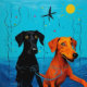 "Aquatic Duo of Joy" - Surreal Colourful Dogs. A pair of colourful dogs, one black and one orange, bask in a playful water setting. The surreal artwork’s vivid hues of black, blue and orange add to the charming expressions making it a standout piece for pet lovers. Labrador and Vizsla dogs.