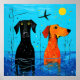 "Aquatic Duo of Joy" - Surreal Colourful Dogs. A pair of colourful dogs, one black and one orange, bask in a playful water setting. The surreal artwork’s vivid hues of black, blue and orange add to the charming expressions making it a standout piece for pet lovers. Labrador and Vizsla dogs.