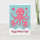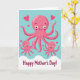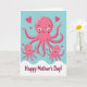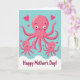 Designed with a light blue background, this card shows three rounded sea creatures in deep pink tones gathered close like a family hug, with the two smaller ones tucked near the larger figure’s sides ❤️. The biggest creature sits in the upper middle, wearing a wide smile and bright eyes that seem to watch over the others with gentle attention. On either side, the smaller creatures echo that happy expression, their tiny faces angled toward the center as if sharing a quiet, friendly moment. Curved tentacle-like limbs fan out beneath them, each decorated with subtle repeating patterns that add texture without crowding the scene. Several floating fuchsia hearts drift around the characters, reinforcing the affectionate, togetherness mood 🌼. A soft, wavy white border runs horizontally to separate the illustration from the lower text area. Below that border, a short Mother’s Day message appears centered in dark crimson lettering against the pale background, with a few pink hearts sprinkled above.
