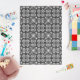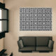 Rug in in an arabesque, geometric, mosaic tile pattern in black and white