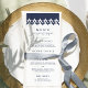 Our elegant wedding menu features your starter courses, entrees and desserts in rich navy blue, accented with a Moroccan inspired geometric border along the top in navy and white. Coordinates with our Arabesque wedding invitation collection.