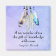 An inspirational motivational arapaho indian tribe / native american proverb which says: If we wonder often, the gift of knowledge will come. The design is created with a watercolor image of four soft delicate looking feathers beaded together hanging down from the top border. The background is a purplish blue watercolor texture.