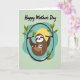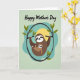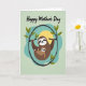 Designed with a gentle nature scene, the card shows a warm brown tree-dwelling animal with a calm face holding a smaller, lighter-toned baby close, their soft smiles and relaxed eyes suggesting quiet affection ❤️. They hang together from a dark, curving branch that loops around them like a protective hug, hinting at a close bond. Bright green leaves dot the branch, adding a fresh contrast against the pale green background. Behind them sits a round, sunny yellow circle that glows like a sun, casting a cozy feel over the pair. A smooth, wavy stripe of aqua blue runs across the middle distance, reading as either sky or calm water and keeping the scene serene. Near the top, the message “Happy Mother’s Day” appears in flowing black lettering, centered above the illustration. Subtle line details on the animals and branch add texture, while the leaves and sun remain simple shapes 🌼. The branch curls in a near-oval frame around the pair, with the green leaves clustered mostly along the upper curve.