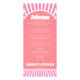 This wedding menu card has a retro groovy style inspired from the 70's with pink as the main color. The front of the card shows a bohemian arch that frames the word menu and the rest text. Behind the arch, there is a background of pink and white sunrays that create a contrast. The back of the card has a diagonal design that repeats the names of the couple in a retro font. This card is perfect for a fun and funky wedding celebration.