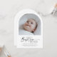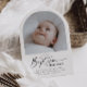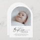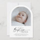 A modern, minimal Baptism Invitation featuring an arched photo and the word 'Baptism' in a calligraphy style font. Please note that you cannot change the 'Baptism' word but you can edit all of the other text in this design. You can change the colour or you can delete it and replace it with a new text box if you prefer.