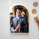 Formal blue arch-shaped college graduation announcement featuring a gold grad cap, the graduate's name and class year in an elegant gold script, their university, major and honors in classic gold serif typography, and their photo on the back of the card.