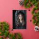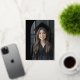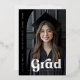 Elegant black graduation announcement featuring your photo inside a half arch frame with real foil text overlay "grad" in a retro style front. Aligned vertically to the left is the graduate's name and school, also in real foil. Custom message and additional photo on the back. The text on the back is white.