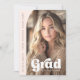 Light blush pink graduation announcement featuring your photo inside a half arch frame with white text overlay "grad" in a retro style front. Aligned vertically to the left is a template filed for the graduate's name and school. Custom message and additional photo on the back.