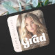 Light blush pink graduation stickers featuring your photo inside a half arch frame with white text overlay "grad" in a retro style font. Aligned vertically to the left is a template filed for the graduate's name.