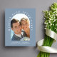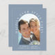 Chic budget-friendly dusty blue elopement announcement and reception invitation. The front features your wedding photo in an arch frame and "Happily Ever After Party" in elegant white typography. Under your photo, add your names, wedding date and location. On the reverse side, personalize your announcement and invitation, add your names in a signature-like script and input your wedding website address to create a scannable QR code for your guests to scan to RSVP online and obtain additional details.