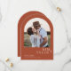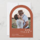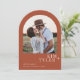 Minimalist trendy chic casual typography script verona sunset burnt orange and white wedding save the date card with custom arch shape photo and text. +++++++++++ Suitable for a rustic modern boho summer garden wedding.