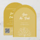 Unique yet beautiful way to send a save the date announcement to friends and loved ones. This wedding save the date card is shown in the arch style and has a tree nature theme. Plus, there is a QR code on the back to send your wedding registry, or website. Shown in gold (front and back). Just change the text to suit your needs. Use the template to personalize.