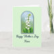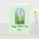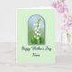 This card features a detailed botanical illustration set inside an arched frame, centered on a vertical spray of small, pure white, bell-shaped blossoms cascading down a slender green stem. Broad, lush green leaves gather near the base, and the gentle droop of the flowers feels like a quiet, caring gesture, as if the plant is leaning in with affection ❤️. Inside the arch, the background shifts from soft sky-blue at the top to a light, grassy green below, suggesting a calm spring morning. A thin blue-green outline traces the arch to give the scene a neat border against the pale mint green field around it. Beneath the illustration, the words “Happy Mother’s Day” sit in deep teal in a flowing, calligraphy-style font, drawing the eye downward. The word “Niece” follows in the same deep teal, placed right after the main phrase like an intimate add-on that makes the greeting feel close and familiar 🌼. The mint background stays even and uncluttered, while the arched panel and teal lettering stand out clearly with the blue-green band framing the blossoms. The white bells are shaded with fine gray-blue touches, and the stem and leaves show layered greens with small veins visible near the base.