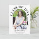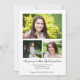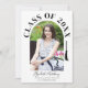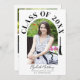 A simple white background featuring a photo of your grad on the front in a trendy arched shape, with the "Class of" and year, and a dangling tassel. Also space to personalize with name, and details. On the back are spots for 3 photos and your invitation details, or announcement wording.