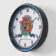 Knights style shield monogram letter A art name simple numbered wall clock in shades of red, golden yellow, blue white and grey. Personalize with your child's own name and name meaning for a personalized touch to your child's bedroom or nursery, this example is for names starting with the letter A. Currently reads Archer Bowman Responsive, practical and strong. Ideal for a gift to a new baby boy, for a christening, baby naming or baby shower gift. Unique shield drawing, graphic art, name research, wording and design by Sarah Trett. www.sarahtrett.com for www.mylittleeden.com