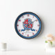 Knights style shield monogram letter A art name simple numbered wall clock in shades of red, golden yellow, blue white and grey. Personalize with your child's own name and name meaning for a personalized touch to your child's bedroom or nursery, this example is for names starting with the letter A. Currently reads Archer Bowman Responsive, practical and strong. Ideal for a gift to a new baby boy, for a christening, baby naming or baby shower gift. Unique shield drawing, graphic art, name research, wording and design by Sarah Trett. www.sarahtrett.com for www.mylittleeden.com
