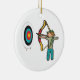 A fun archery design shows archer aiming arrow at competition target. Uses traditional powerful wooden longbow with red grip design and wears quiver and special archery hat!