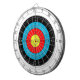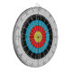 Dart board in the style of an archery target practice face, with yellow, red, blue, black and white concentric circles with black and white text for the numbers for points of each circle.