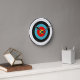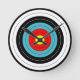 Clock with an archery target featuring concentric rings of gold, red, blue, black, and white. Customizable. A great clock for the sports enthusiasts in your life.