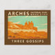 Arches vector artwork design of Three Gossips sandstone tower atop a pedestal within Courthouse Towers cluster. The park lies north of Moab in the state of Utah. Bordered by the Colorado River in the southeast, it’s known as the site of more than 2,000 natural sandstone arches.