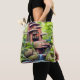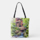 Beautiful all-over-print women's tote bag features an AI generated digital watercolor of a F.L. Wright prairie style architectural treehouse.