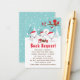 This cute and fun book request enclosure card features an adorable arctic fox family in a winter wonderland setting with snow capped trees and a red bird on a branch with holly. The foxes in Santa hats add a festive touch. In the background is a teal blue green sky and falling snowflakes. The text combines decorative and sans serif fonts for a stylish and modern look. This is perfect for a Christmas themed baby shower.