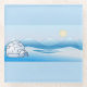 A cool little Arctic scene with an igloo and a pale yellow, sun rising above snowy mountains on a pale blue background.