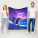 A soft fleece blanket featuring glowing penguins under a purple arctic sky.