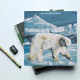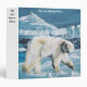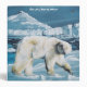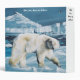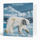 A white polar bear in the snow if the arctic winter with an iceberg in behind.