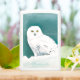 A snowy owl in the arctic snow of winter with a teal blue sky